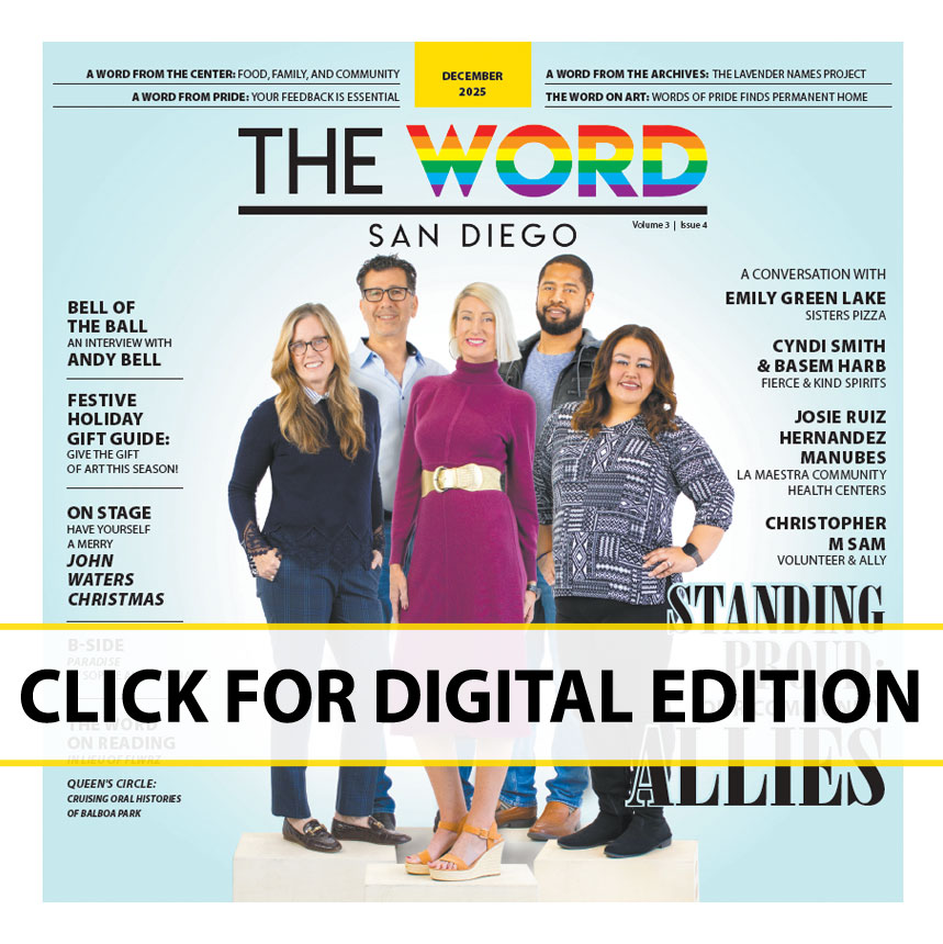 Cover Story Standing Proud: Our Community Allies Investing in a Stronger, More Inclusive San Diego December 3, 2025December 3, 2025 thewordsd.news A Word From The Center Food, Family, and Community: The Center’s Commitment This Holiday Season Entertainment Bell of the ball: an interview with Andy Bell On Stage Have yourself a merry John Waters Christmas A Word From Pride Art of Pride and San Diego City College Present: “Towards a Queer Historiography” — Reclaiming History Through the LGBTQIA+ Lens A Word From Pride Strategic Planning: Your feedback is essential to this process A Word From The Archives The Lavender Names Project: Call for Community Photos The Word On Art Festive Holiday Gift Guide: Give the Gift of Art This Season! The Word On Art Words of Pride: Artwork Finds a Permanent Home The Word On Art End-of-the-Year Sparkle at The Studio Door B Side Paradise by Sophie and the Giants The Word On Reading In Lieu of Flwrz and Queen’s Circle B Side Doja Cat – One More Time FILM Film SDAFF Southeast Asian American Journeys: A Conversation with Director Quyên Nguyen-Le October 30, 2025November 5, 2025 thewordsd.news Film Carmen Emmi on Plainclothes, Queer Storytelling, and the Power of Coming Home August 2, 2025August 6, 2025 thewordsd.news Film Reflections, Rewrites, and Raw Truths: Exit Interviews Finds Beauty in Emotional Honesty August 2, 2025August 6, 2025 thewordsd.news Film FilmOut San Diego presents Flash Gordon April 2, 2025April 2, 2025 thewordsd.news SAN DIEGO PRIDE GUIDE 2025 Latest Video Trending Standing Proud: Our Community Allies Investing in a Stronger, More Inclusive San Diego December 3, 2025December 3, 2025 thewordsd.news Food, Family, and Community: The Center’s Commitment This Holiday Season December 3, 2025December 3, 2025 thewordsd.news Art of Pride and San Diego City College Present: “Towards a Queer Historiography” — Reclaiming History Through the LGBTQIA+ Lens December 3, 2025December 3, 2025 thewordsd.news Strategic Planning: Your feedback is essential to this process December 3, 2025December 3, 2025 thewordsd.news The Lavender Names Project: Call for Community Photos December 3, 2025December 3, 2025 thewordsd.news Follow Us Facebook-f Instagram