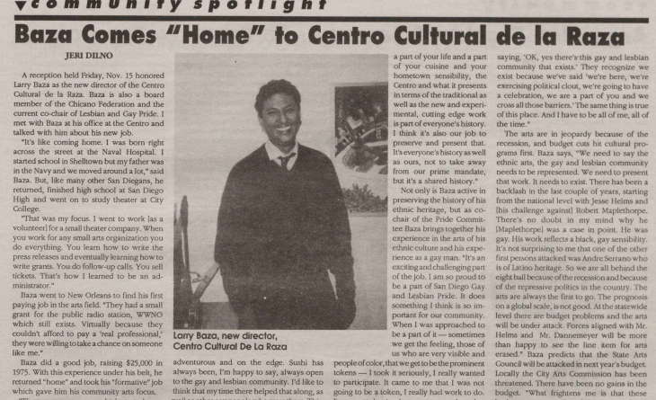Since then, I have been on a journey to find a way to fully honor and inhabit both my queerness and my heritage as a CHamoru person. A few years ago, I discovered the legacy of Larry T. Baza. I was familiar with Larry’s name before I knew his full story. Larry dedicated his life to promoting arts and culture in San Diego. From working the concession stand at the Starlight Bowl in Balboa Park as a teenager, to becoming the director of the Centro Cutural de la Raza, Larry built a life rooted in storytelling, representation, and community. He understood that our stories – queer stories, Chicano stories, CHamoru stories, and so many others – are not separate from who we are. They are essential to it.